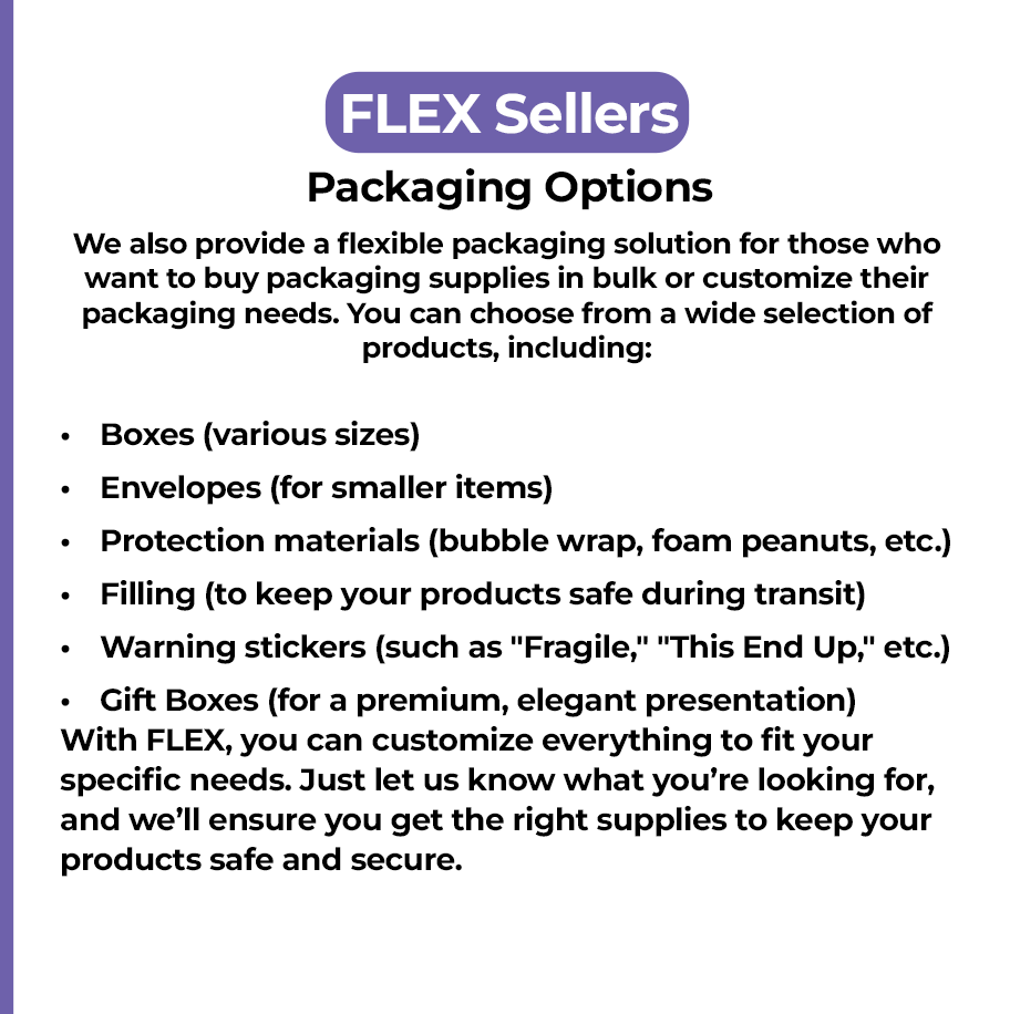 We understand that packaging is a crucial part of your product’s presentation and safe delivery. That's why we offer a variety of packaging options to suit your needs. Whether you're shipping a single product or preparing multiple items for sale, we have the packaging supplies and services to ensure your products reach their destination in perfect condition.
