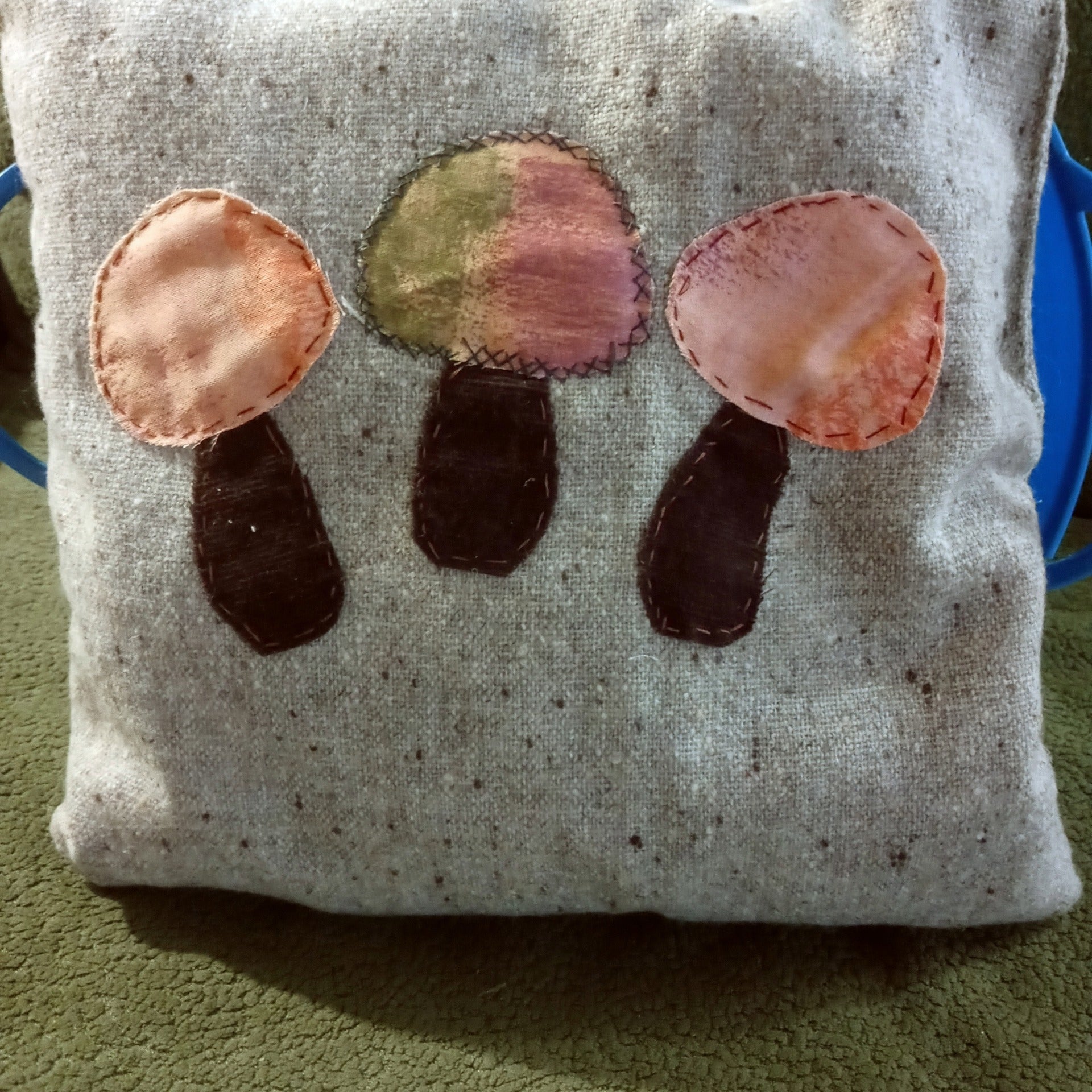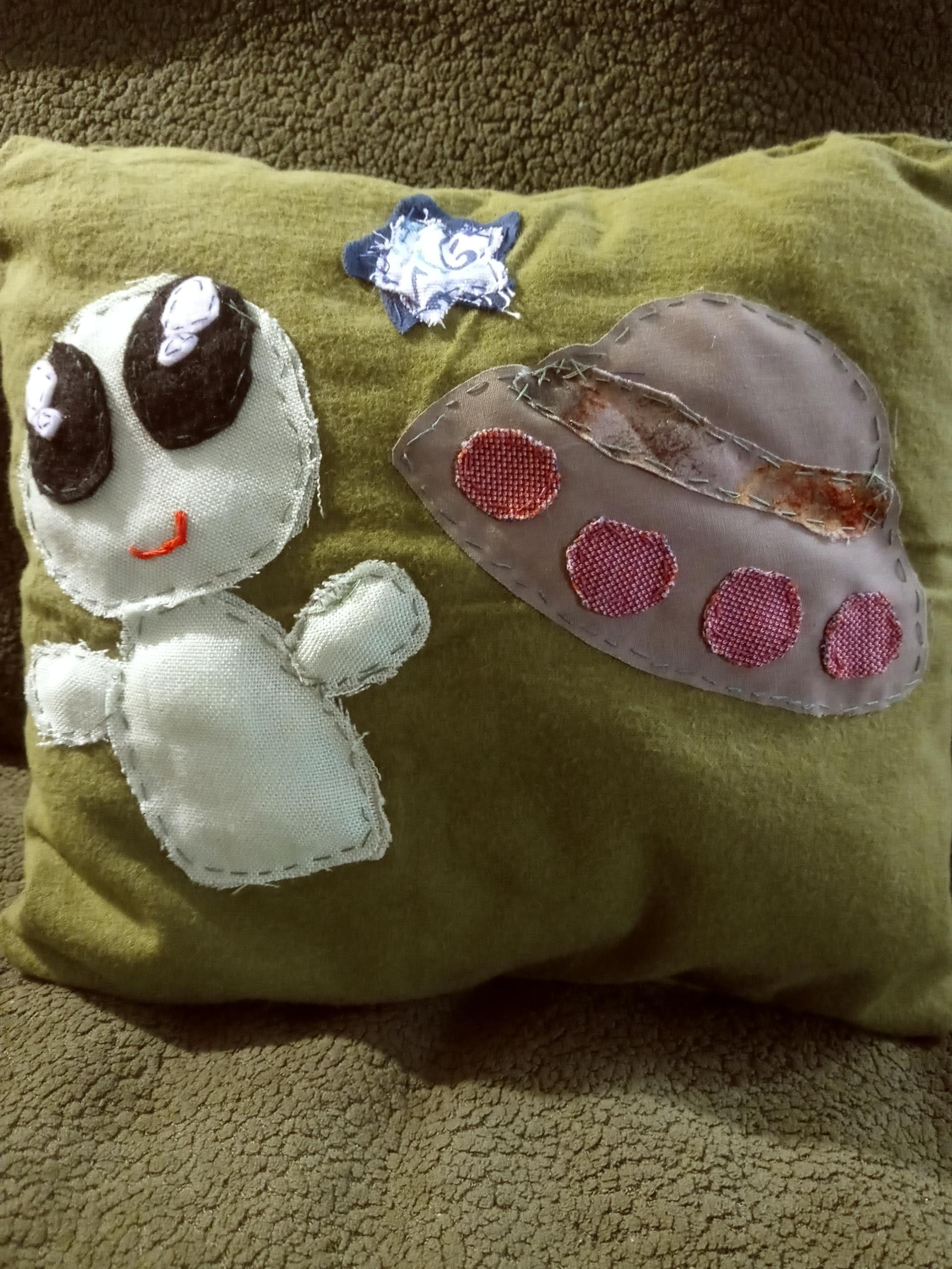 11.5"x11.5" pillow featuring alien couple, stars, UFO and earth and sun on the reverse, stuffed with plastic bags, handsewn and designed.