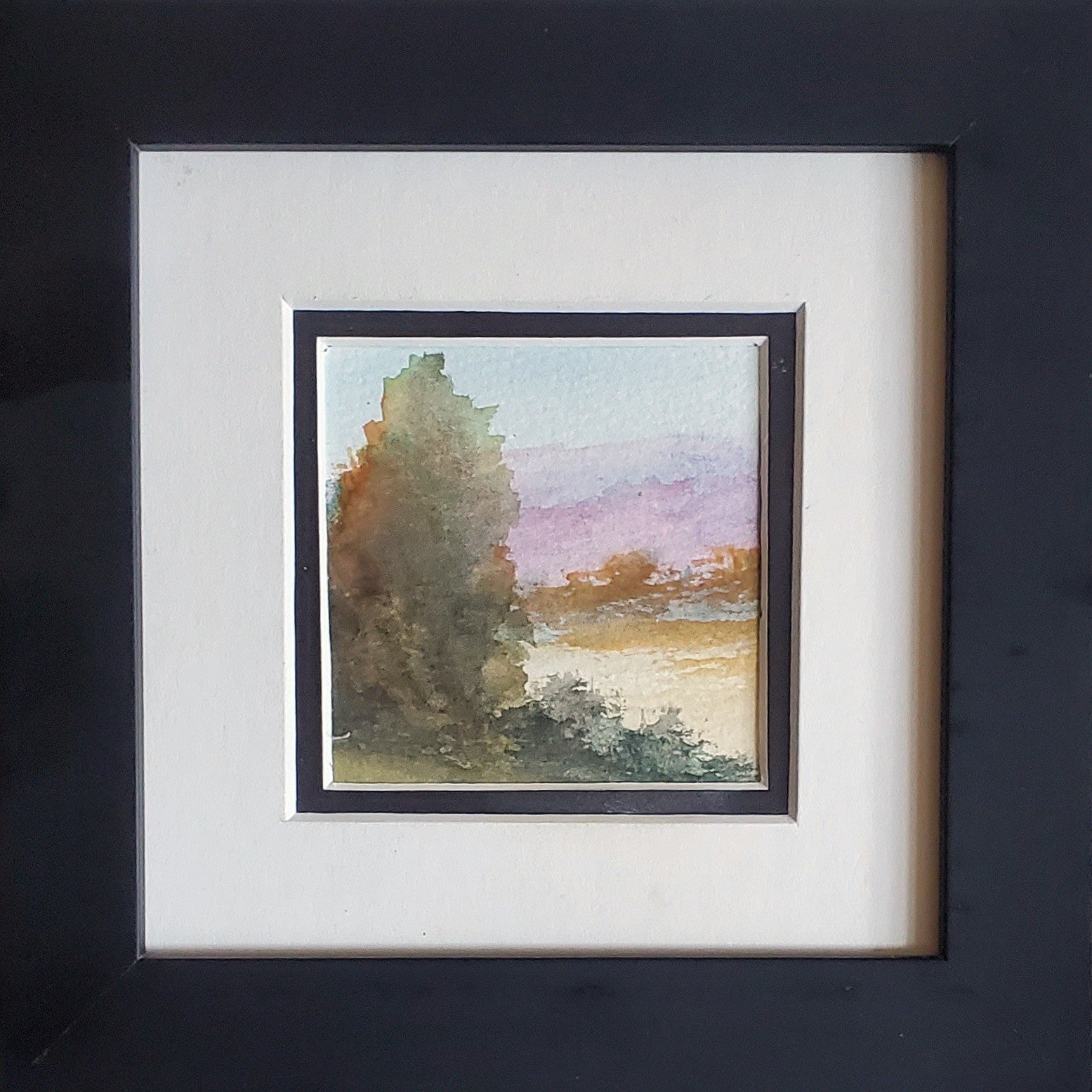 I’ve just finished a new watercolor called Early Rise. It’s a small piece, only 2 1/2 by 2 1/2 inches, matted to 5 by 5. The painting captures a quiet morning landscape where a tall tree stands firmly on the left, its deep greens and browns contrasting with soft purples and pinks that suggest distant hills. On the right, warm beige and yellow tones open into a field, offering a sense of calm and openness. I was inspired by the gentle colors of the sunrise here in the up country, wanting to reflect that moment of stillness and renewal. The delicate brushstrokes move softly across the paper, inviting a pause that feels both intimate and expansive.