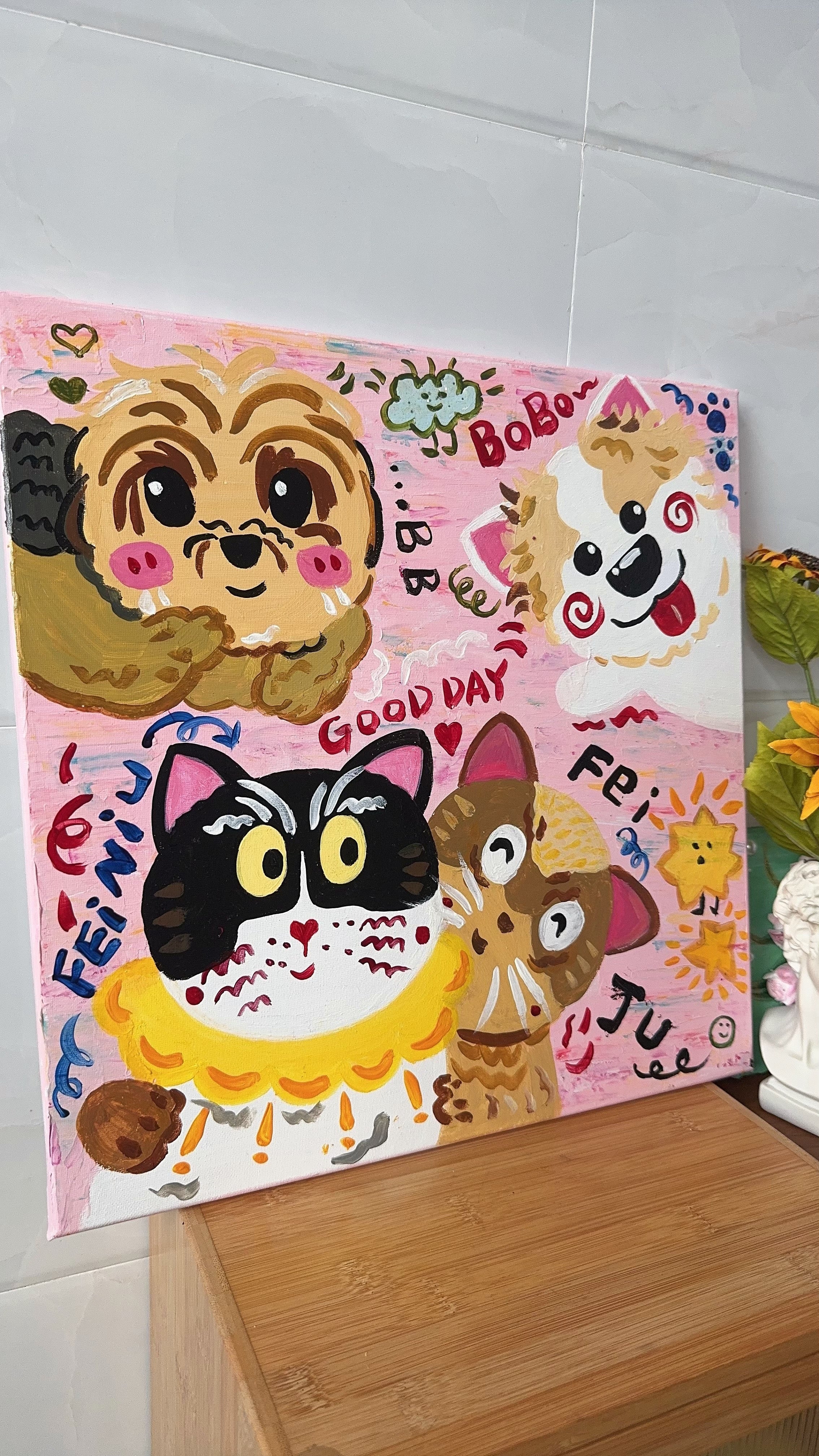 This delightful canvas features a colorful and playful depiction of cats and dogs, radiating warmth and joy. With vibrant tones and lively textures, this hand-painted artwork is perfect for adding a cheerful vibe to any room. Whether for pet lovers or as a statement piece, this art will make every day feel brighter.