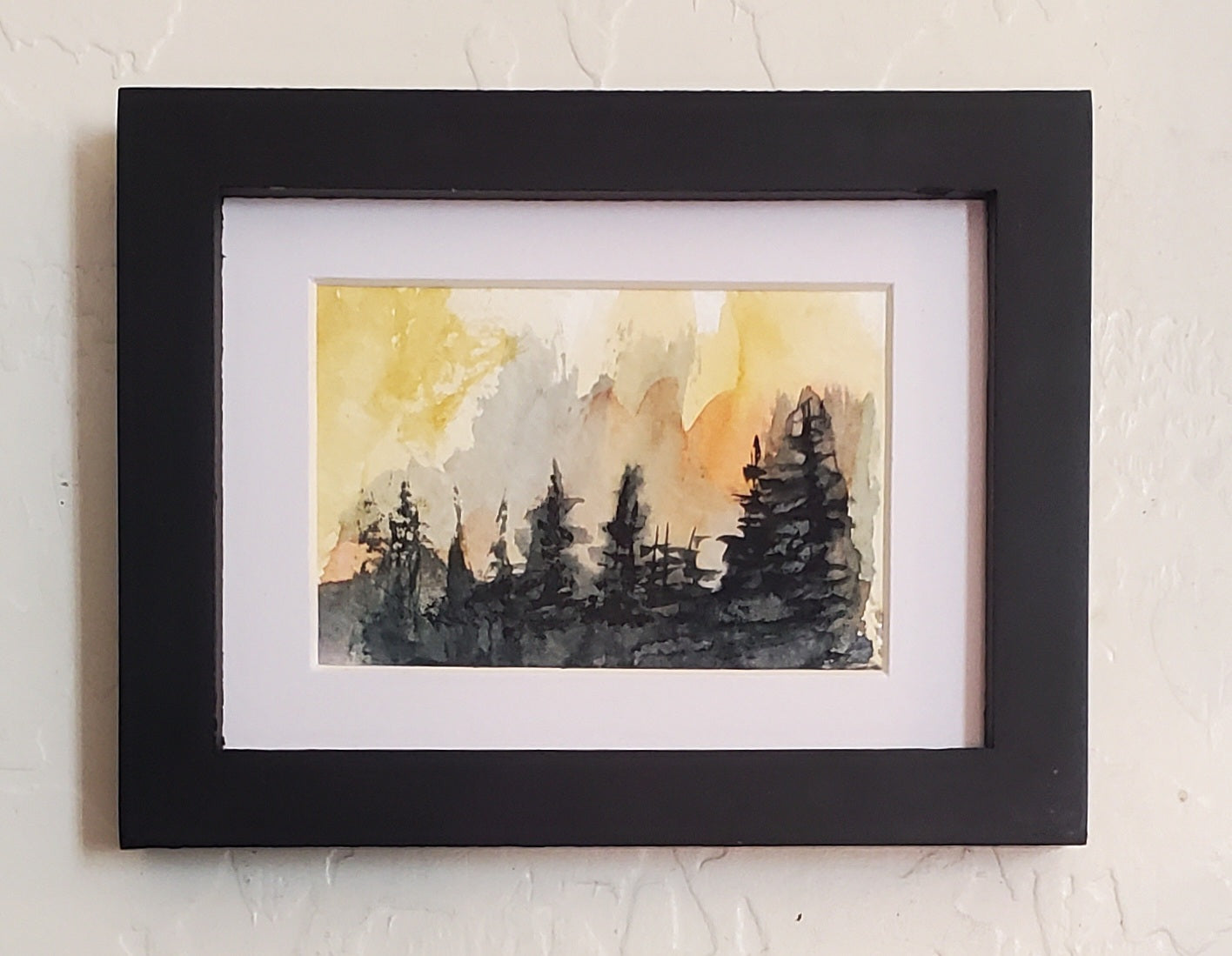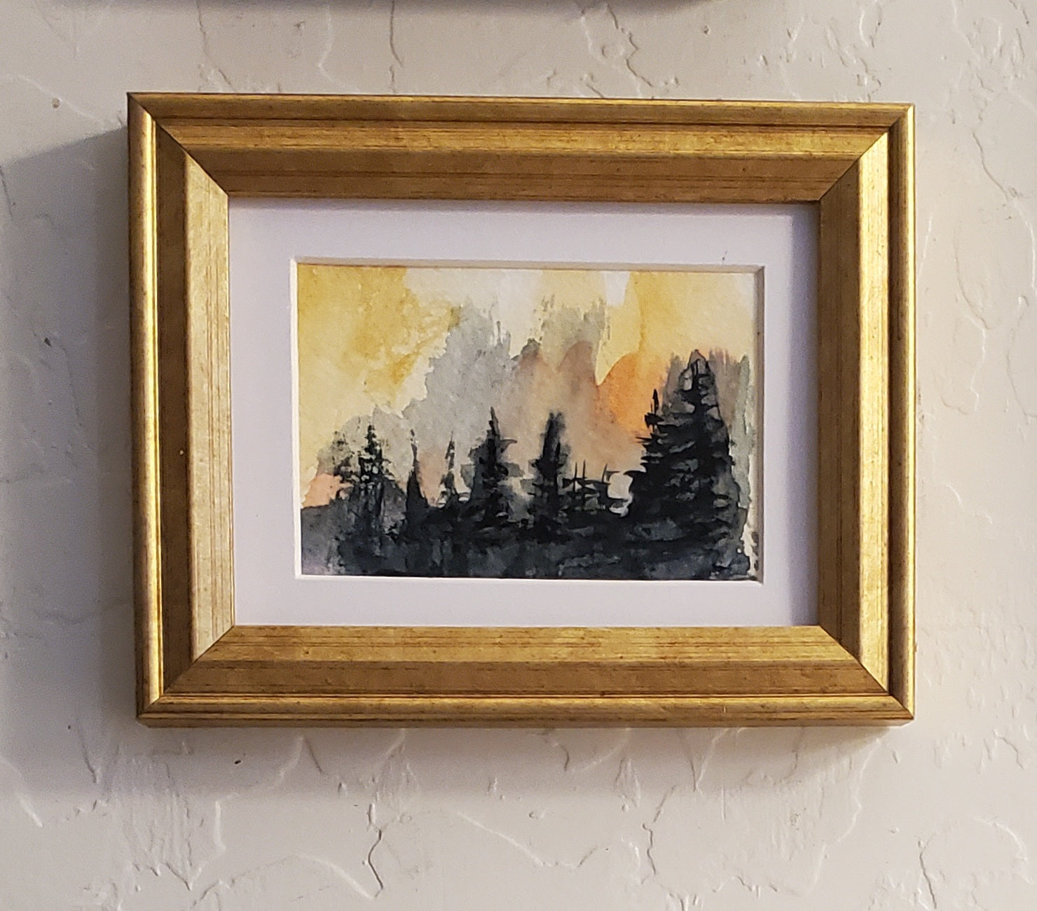 Twilight Pines is a small watercolor painting, just 2 by 3 inches, matted to 3 by 4 inches. It captures a quiet forest scene where tall pine trees stand dark against a sky shifting through soft yellows, oranges, and muted grays. I used loose brushstrokes to convey the mood and subtle changes in light that suggest either the moment just before day begins or just after it ends. The work feels both still and alive, a pause shaped by nature’s quiet transitions, framed simply to keep that focus clear. Your choice of gold or black frame