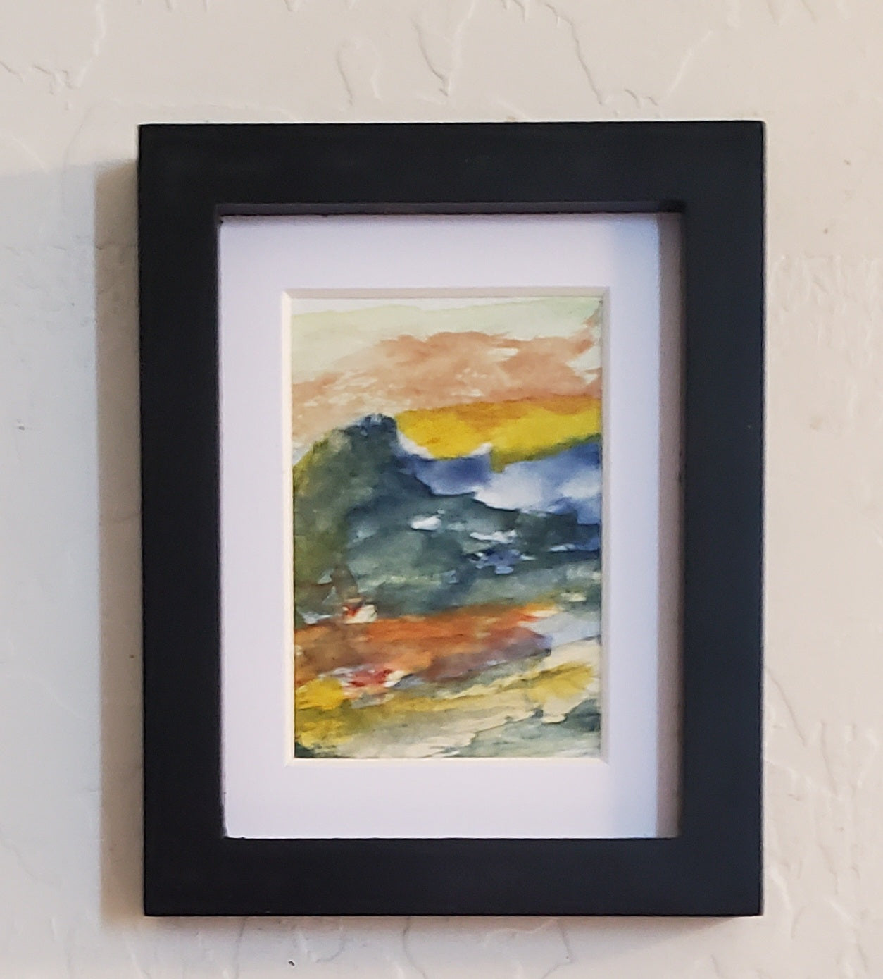 Whispered Hues is a small watercolor study measuring 2 by 3 inches, matted to 3 by 4. This piece captures the quiet presence of a local Butte silhouetted against a sunset. I used soft, blended washes of yellow and muted green to suggest the earth below, while loose brushstrokes of blue and deeper greens form gentle hills. The sky moves through warm shades of orange and yellow, marking that moment when day begins to shift. Framed simply with black and white, the painting invites a calm focus on the interplay of color and form—a quiet landscape drawn from evening light. This work grew directly from evenings spent watching those shifting skies, where nature’s subtle tones speak plainly. I am including a mini black easel with this painting. FREE